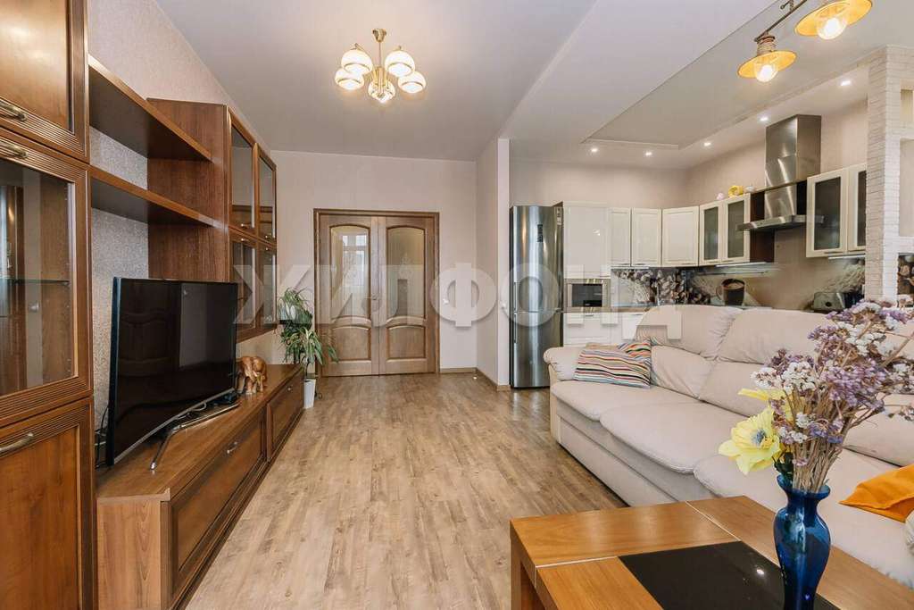Удачная планировка, общая площадь 92 кв. м., из них кухня-гостиная 30 кв. м. с панорамными окнами, две спальни по 15 и 20 кв. м., балкон на два окна с видом на город, раздельный санузел, в прихожей оборудована гардеробная.