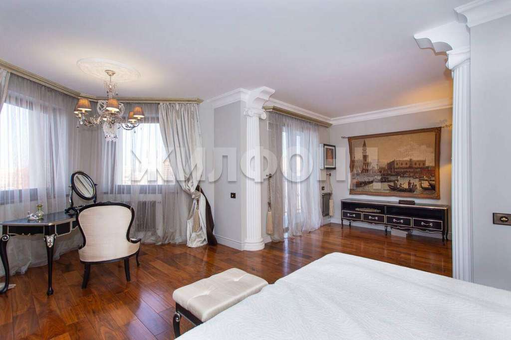 На втором этаже встречает Ваша спальная комната с большой гардеробной и ванной комнатой. На полу в комнате паркетная доска. Есть кондиционер в виде картины и приточка, которая регулируется по температуре и мощности потока. В ванной комнате натуральный мрамор с отделкой из сусального золота, стоит дорогая сантехника и фурнитура. Имеется скрытая постирочная зона.