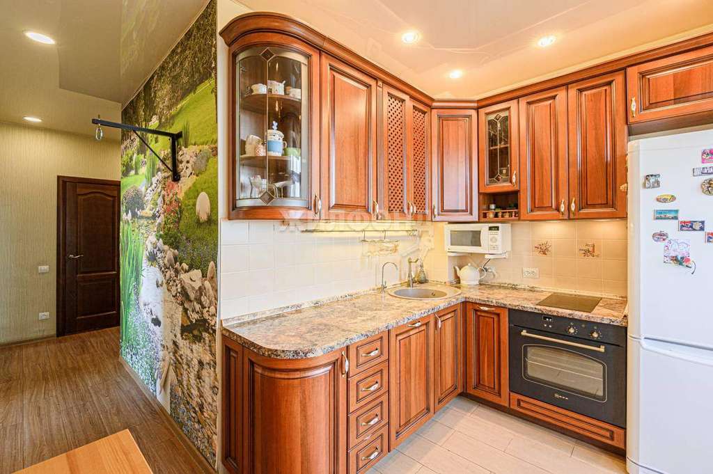 На кухне пол - керамогранит. Натяжные потолки во всей квартире. Высота потолков 2,7 метра , широкие подоконники. Французское остекление.