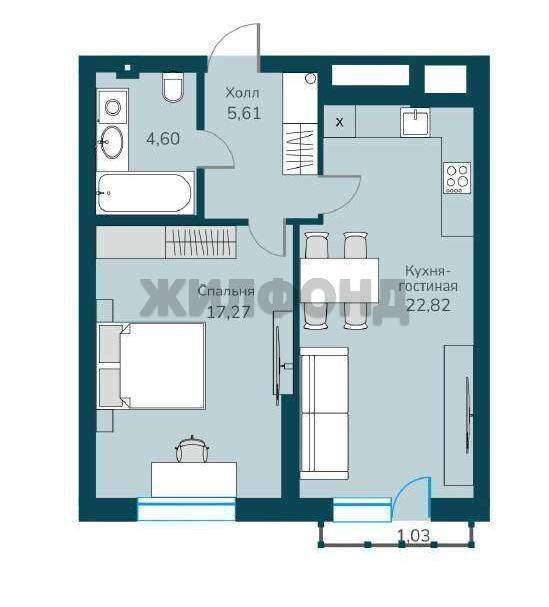 1 комн. квартира по ул. Владимира Заровного. Общей площадью: 50.30 кв. м.