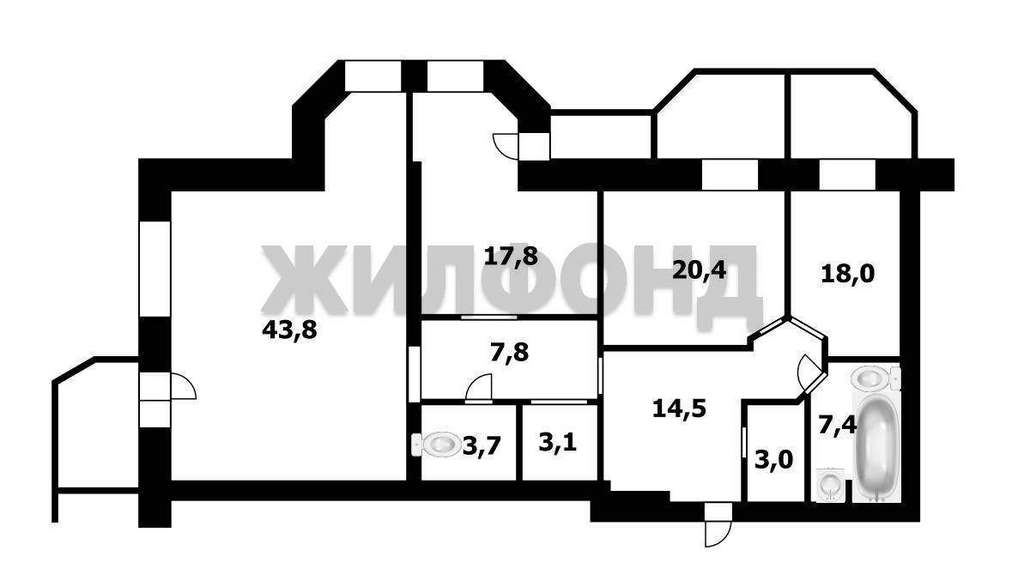 Замечательная планировка: прихожая 22 кв. м., большая кухня 43 кв. м., спальня 17,8 кв. м., две детские комнаты 20,4 кв. м. и 18 кв. м., три просторных застекленных лоджии, два санузела. Окна на обе стороны дома.
