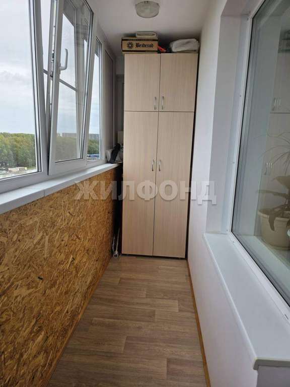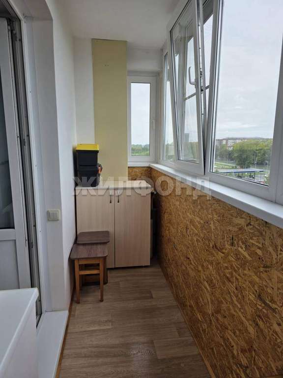Просторная лоджия застеклена, на полу линолеум.