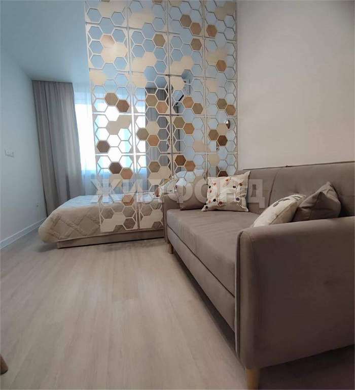 Грамотно зонированная комната 16,6 м2, совмещает спальню, гостиную с диваном, кабинет.