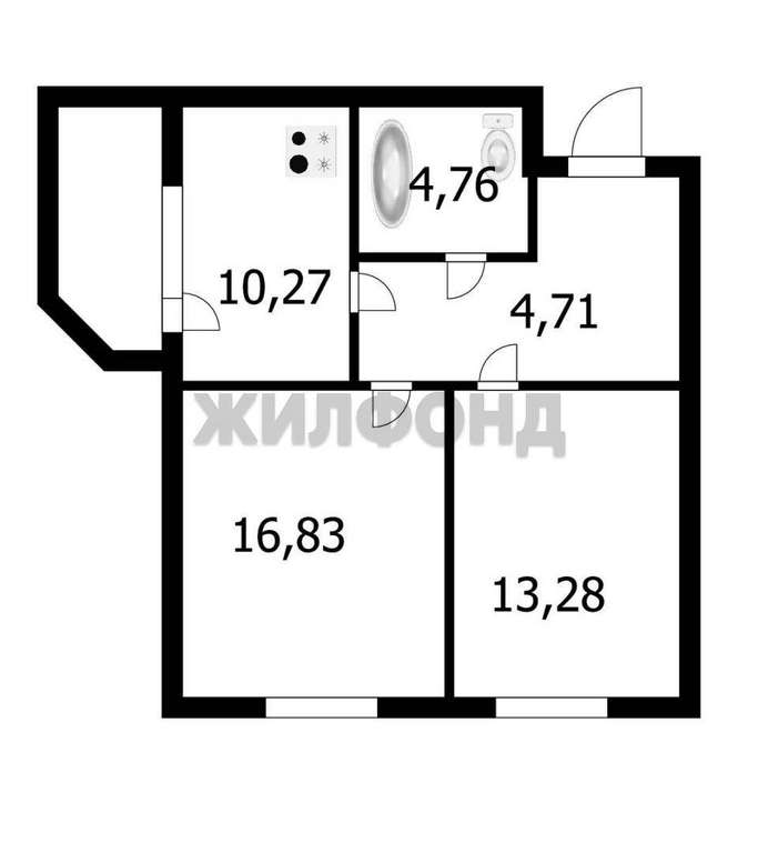 Удачная планировка (просторная кухня 10,27 квм, комнаты квадратной конфигурации 16,8 кв м и 13,2 кв м)