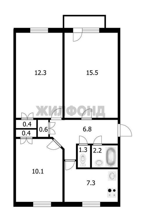 Квартира расположена на 4 этаже 5-этажного дома, общая площадь 57 кв. м.