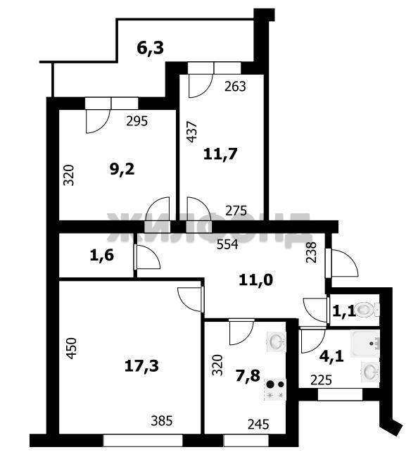 Общая площадь квартиры 63,8 кв. м. (включает площадь балкона)
