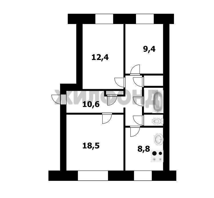 Комнаты - 18,5м2, 12,4м2, 9,4м2