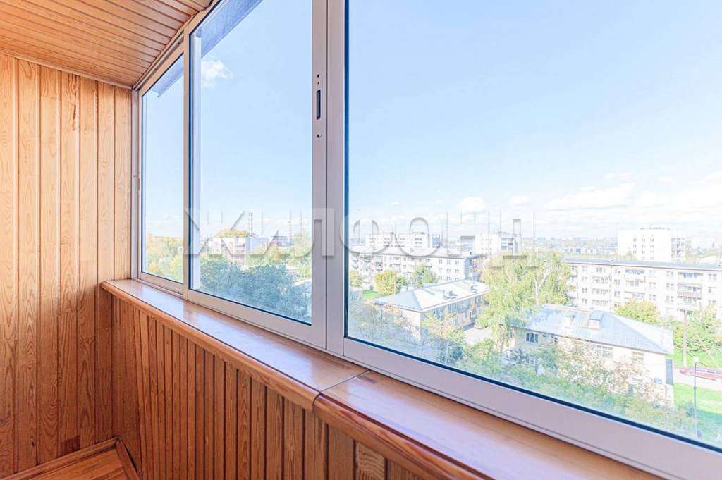 *большая остекленная и обшитая деревом лоджия.,