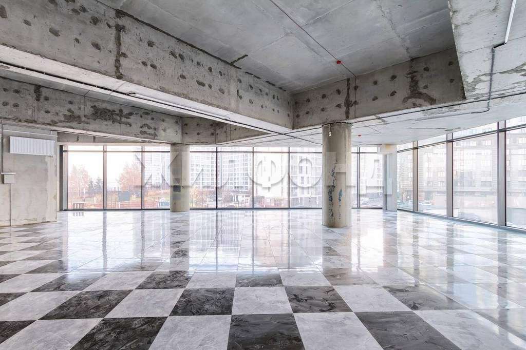 Два входа, свободная планировка и протяжённый витраж - позволяют зонировать помещение под различные