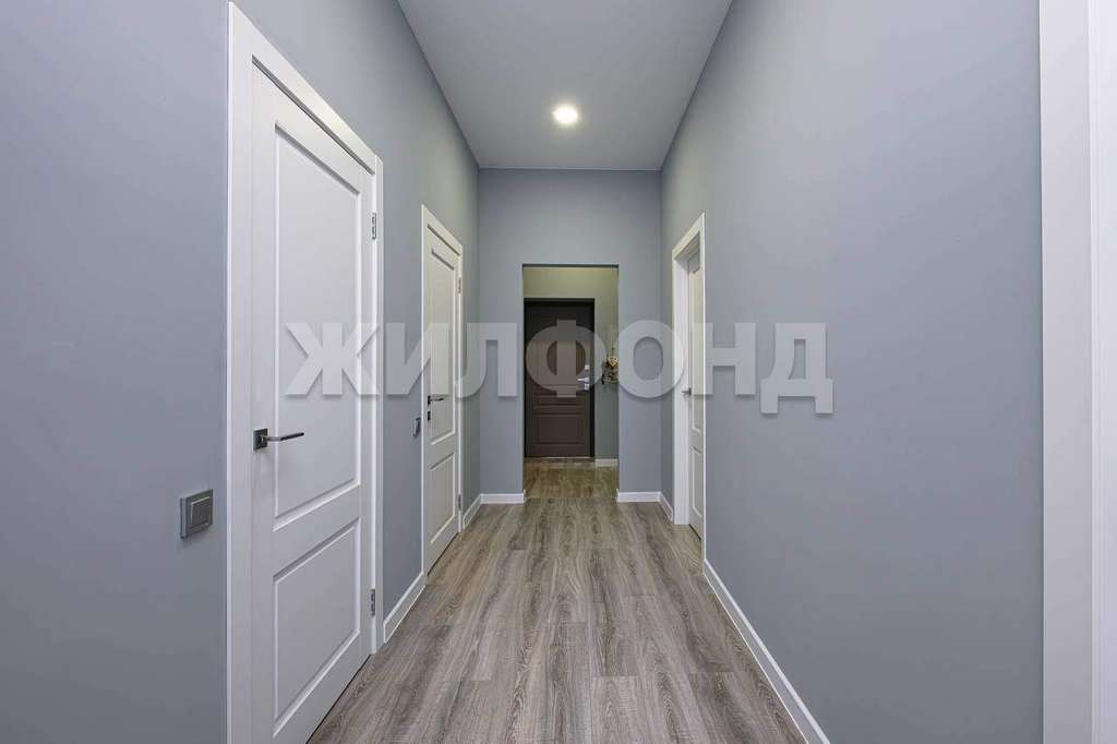 На полу качественный ламинат в серых тонах, в прихожей плитка, потолки натяжные светлые матовые.