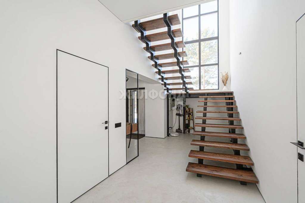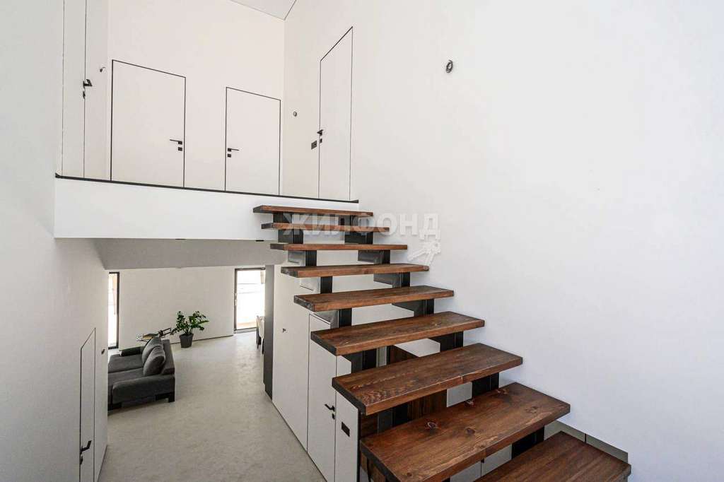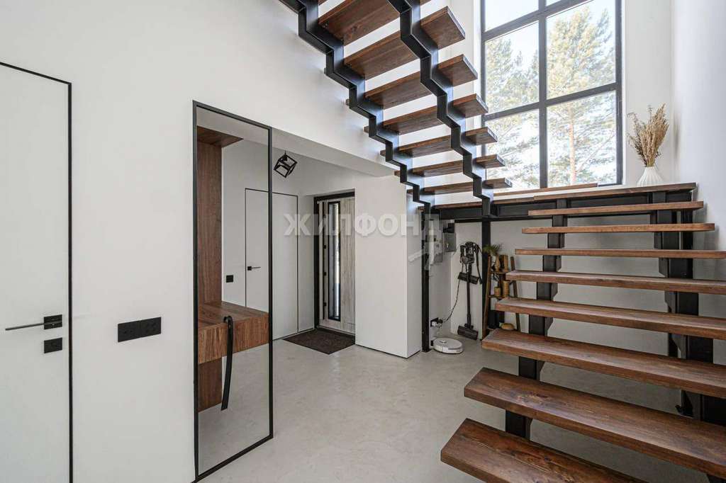 ПЕРВЫЙ ЭТАЖ: просторная КУХНЯ-ГОСТИНАЯ 41,5 м2 с двумя панорамными окнами и выходом во двор, поделена на обеденную зону и зону отдыха., СПАЛЬНЯ 15,1 м2., санузел с большой душевой 6,8 м2., котельная (она же постирочная-хозяйственная комната) . Парящая лесница на верхний этаж со вторым светом.