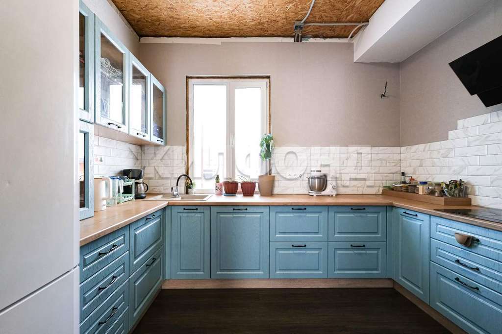 На первом этаже большая светлая комната-гостиная, две спальни, современная кухня с дизайн-проектом , оснащенная передовой техникой, вместительными шкафами и полками. На втором этаже свободная планировка для размещения трех комнат и санузла. Имеется выход на лоджию и на балкон. В дом заведен газ, установлен 2-х контурный котел, скважина . Имеется новая баня.