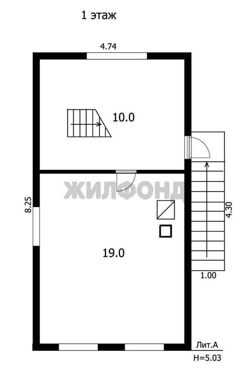 На цокольном этаже размещен гараж и подсобное помещение, 1-ый этаж кухня 10 кв. м и комната 19кв. м, 2-ой этаж спальня 9 кв. м и проходня комната 9 кв. м