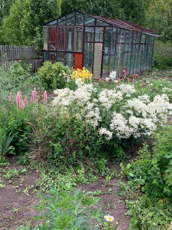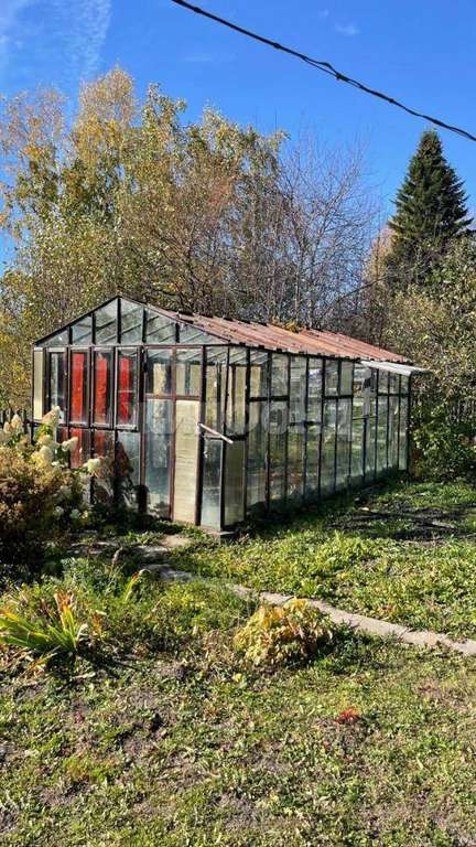 Стеклянная большая теплица. Участок ухоженный, обработанный.