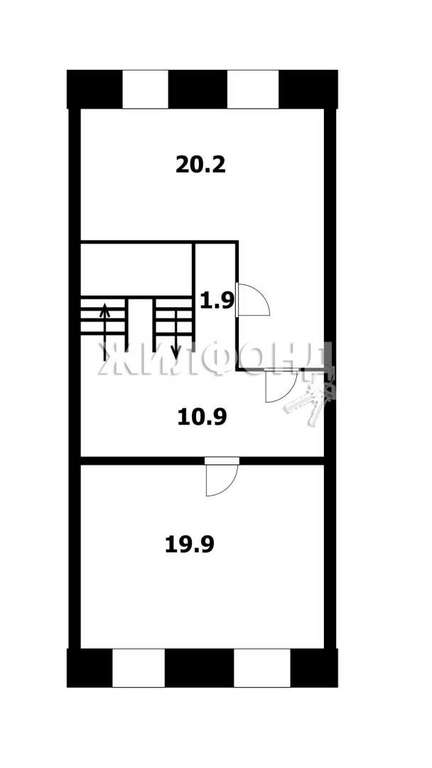 Планировка дома: на первом этаже располагается прихожая, коридор, кухня-гостиная, большой зал (32 кв. м) с тремя окнами, санузел.