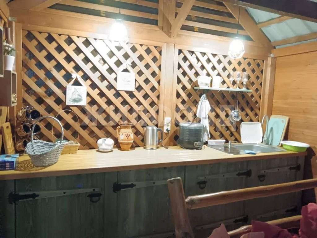 Беседка 6*4 с кухонным гарнитуром, сделанным на заказ. Заведена горячая и холодная вода. Используем как летнюю кухню и место для отдыха. Есть возможность сделать детский уголок, все крепления есть в беседке.